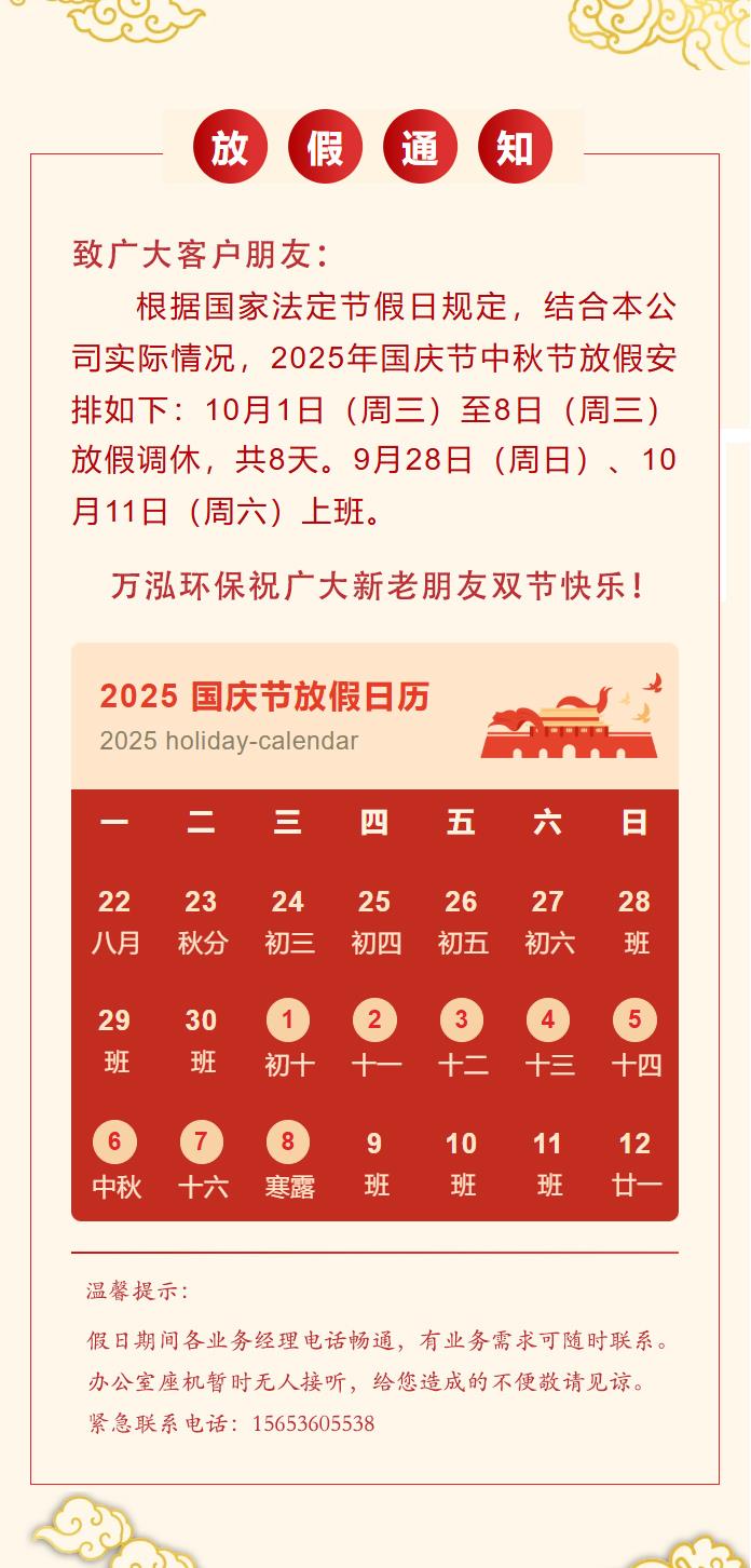 筑梦灯火万家,同庆盛世中华。明月如诗,与国同庆。山东万泓环保祝大家2025国庆中秋双节快乐!